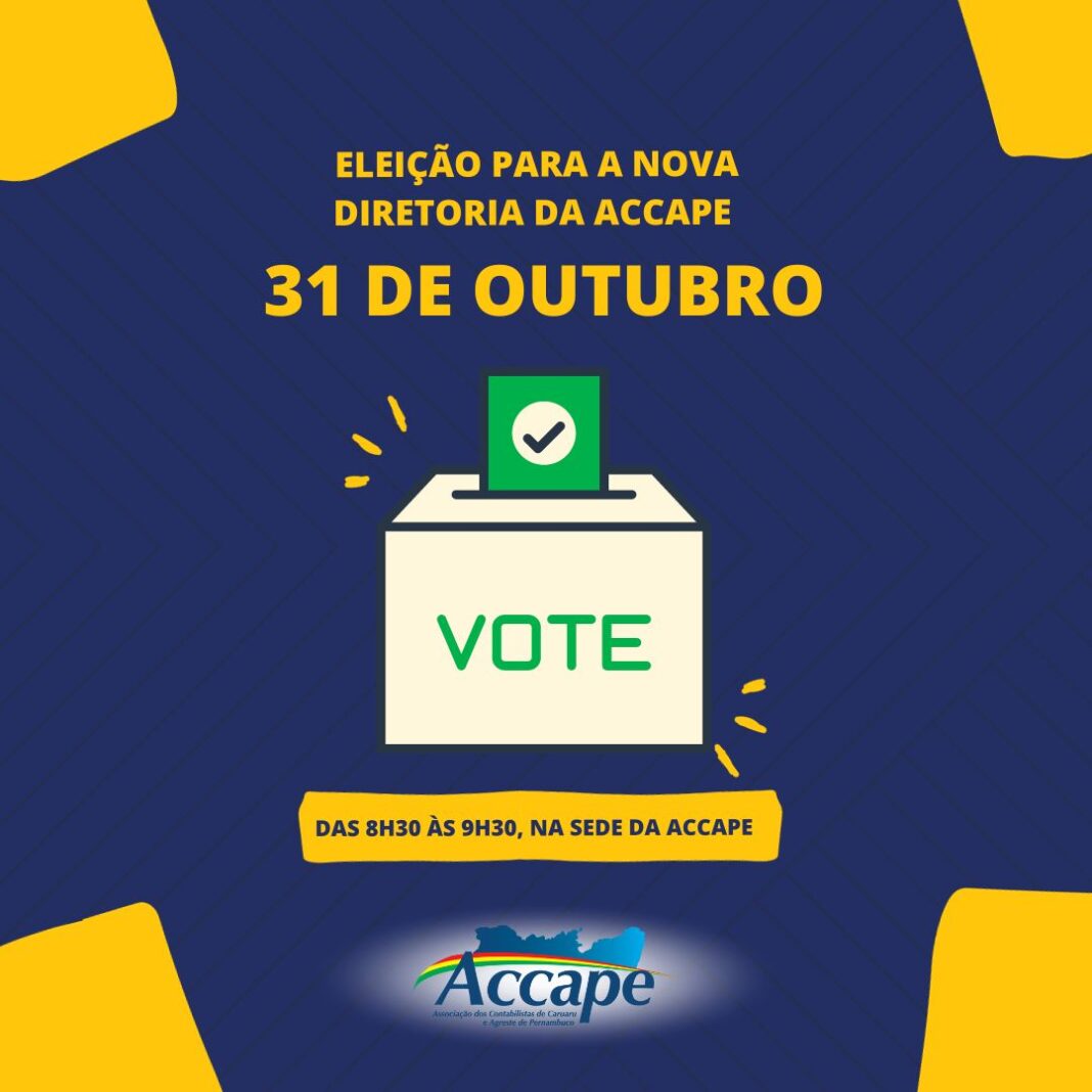 A Associação dos Contabilistas de Caruaru e Agreste de Pernambuco (Accape) convoca os associados aptos a votar a comparecerem à reunião da Assembleia Geral na próxima terça-feira (31), das 8h30 às 9h30, na sede da associação, com o objetivo de eleger a nova Diretoria Executiva, Conselho Fiscal, suplentes do Conselho Fiscal e Departamento de Eventos, cujos membros ficarão à frente da entidade no próximo biênio 2024-2025.