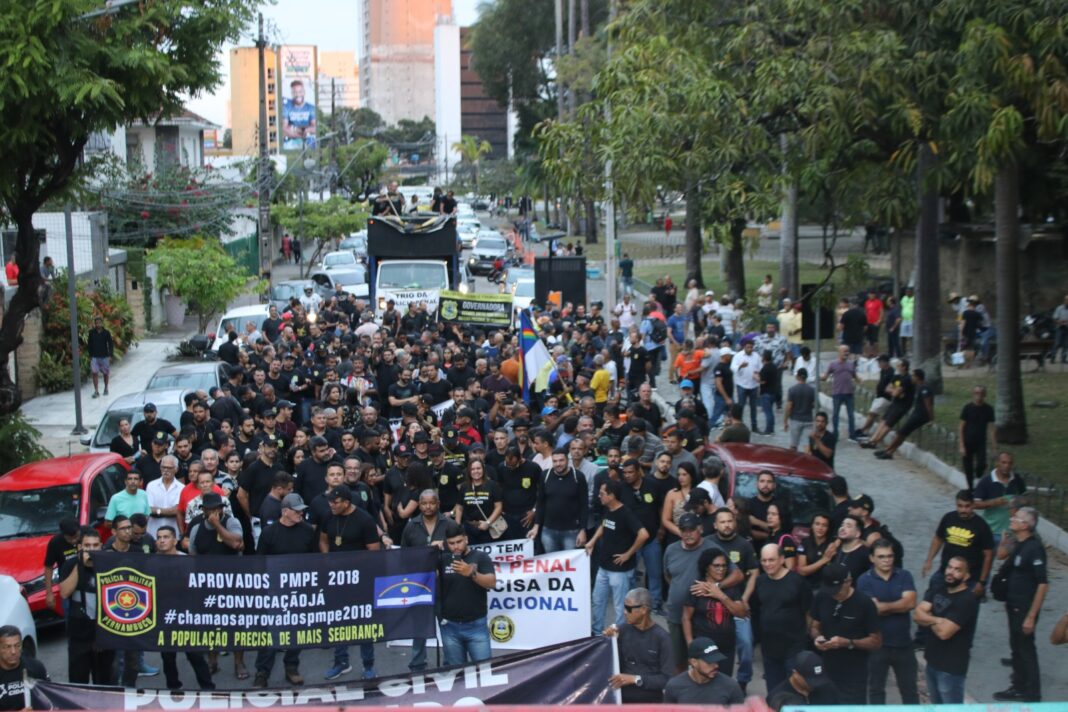 Sindicatos e associações do Fórum dos Servidores da Segurança Pública de Pernambuco realizaram uma passeata, nesta quinta-feira (26), na área central do Recife. Entre as principais pautas das categorias, estão investimentos na estrutura das polícias, valorização salarial e contratação de pessoal.