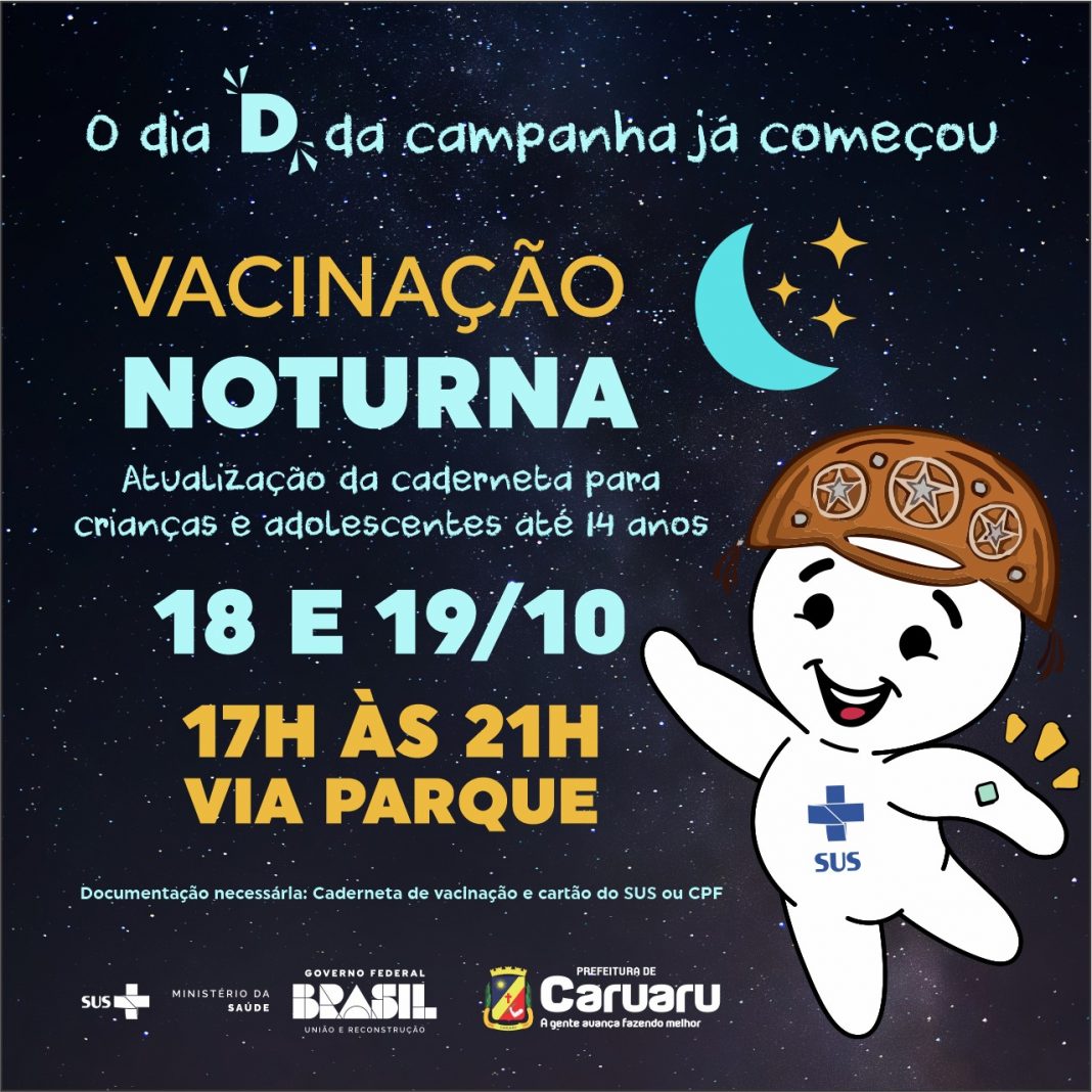 Dando prosseguimento à Campanha de Multivacinação para crianças e adolescentes com até 14 anos, e com o intuito de oferecer uma oportunidade a mais para que pais e responsáveis possam levar os filhos para atualizar a caderneta vacinal em horário diferenciado, a Secretaria de Saúde de Caruaru (SMS), por meio do Programa Municipal de Vacinação (PMI), realiza nesta quarta (18) e quinta (19), a vacinação noturna. A ação vai acontecer na Via Parque, em frente ao INSS, das 17h às 21h.