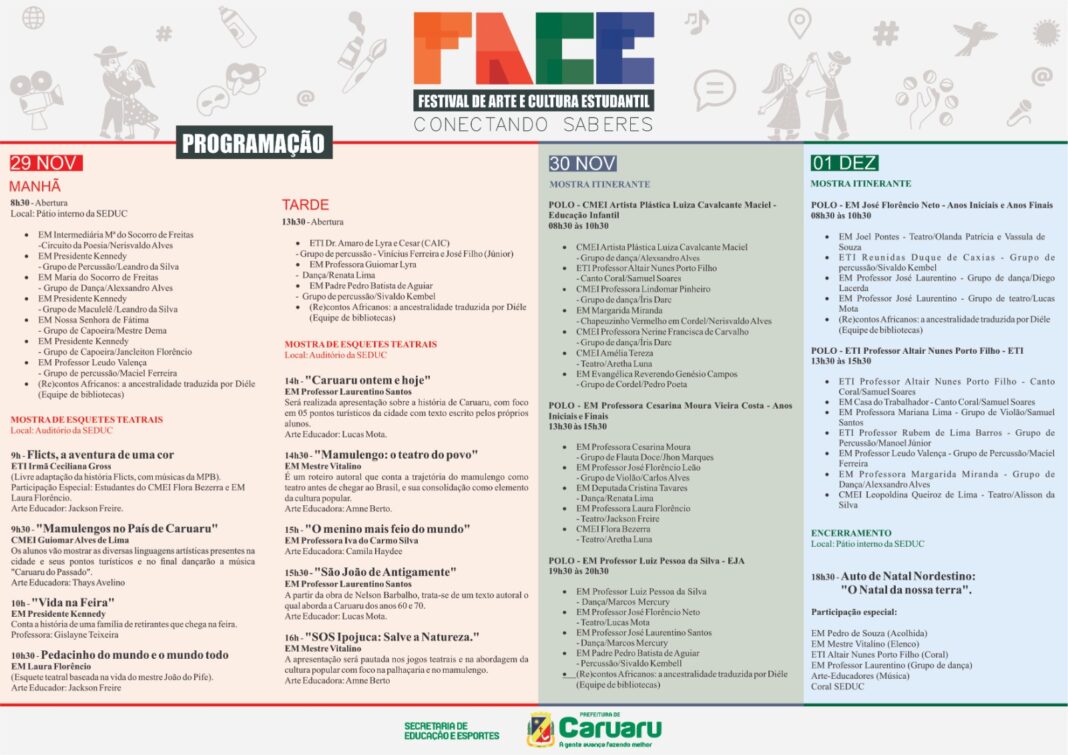 No segundo dia (30) serão realizadas apresentações nos polos itinerantes de CMEIs e Escolas Municipais e o evento encerra na sexta-feira (1º) com um belíssimo Auto de Natal, às 18h30, na sede da Seduc para o público e autoridades de Caruaru.