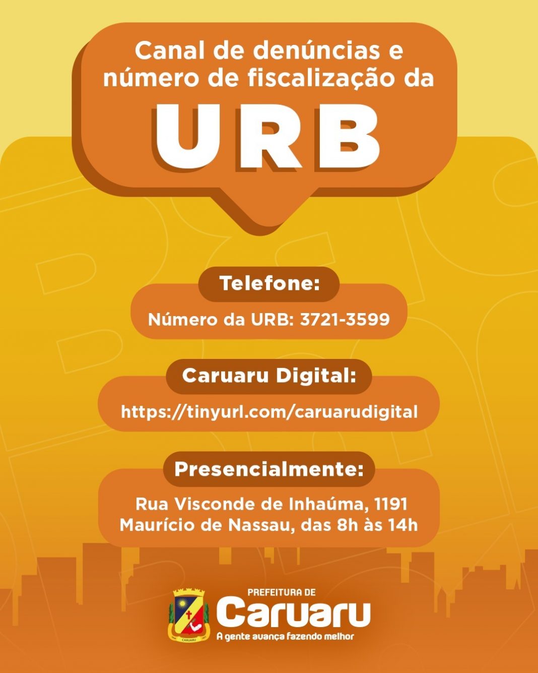 A Prefeitura de Caruaru, por meio da Autarquia de Urbanização e Meio Ambiente (URB), divulga o canal oficial de denúncias e também o número da fiscalização do órgão para a população. De forma geral, os moradores do município poderão denunciar tanto irregularidades ambientais como também urbanas.