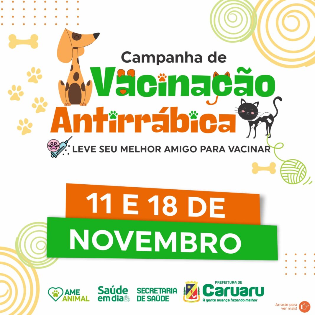 A Prefeitura de Caruaru, por meio da Vigilância em Saúde, da Secretaria de Saúde (SMS), realiza a Campanha de Vacinação Antirrábica para cães e gatos nos próximos dois sábados, dias 11 e 18 de novembro. A ação será realizada em 37 bairros, com 50 pontos de vacinação que funcionarão das 8h às 17h. A expectativa é que mais de 40 mil cães e gatos sejam imunizados nos dois dias da campanha.