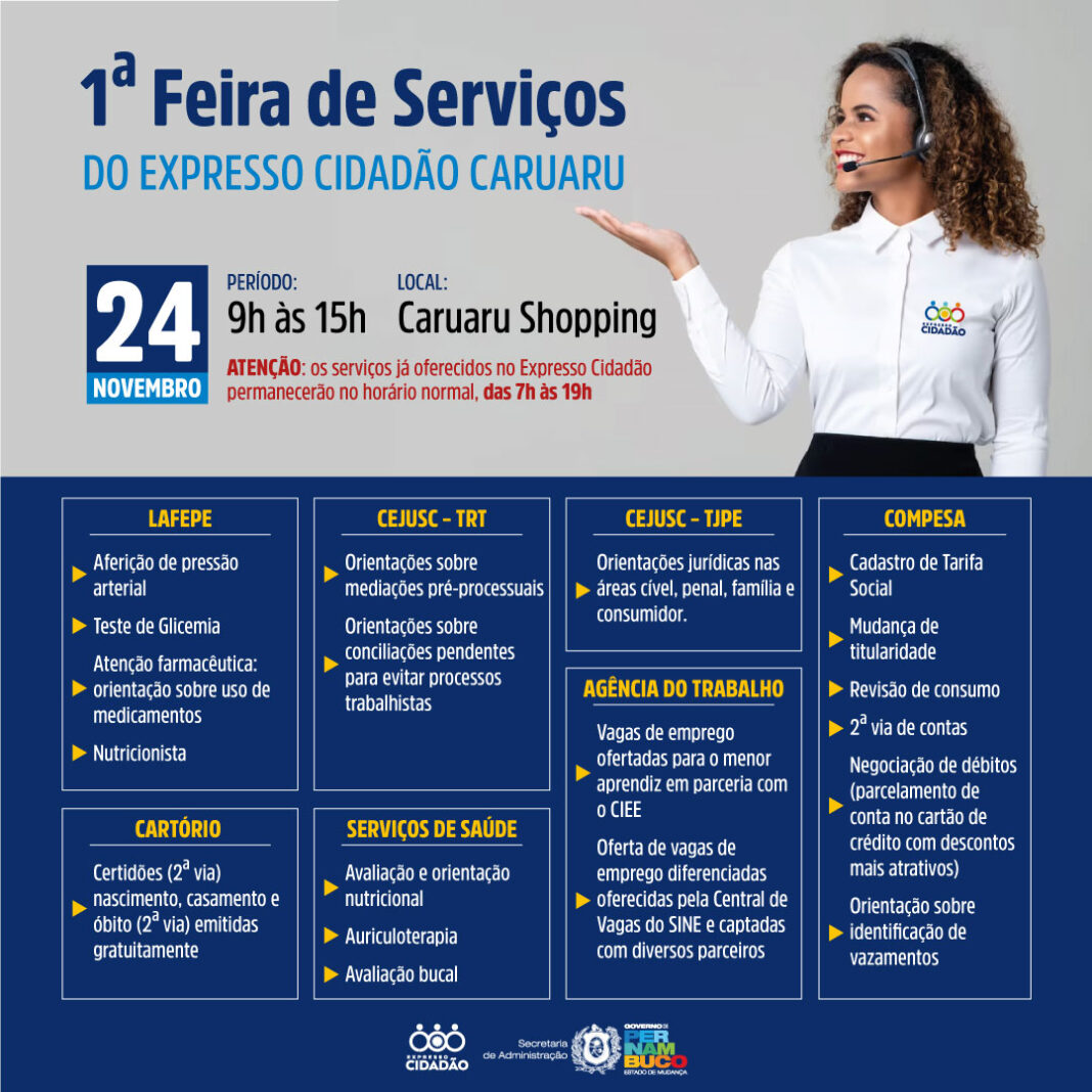 Para ampliar a oferta de serviços à população, bem como agregar mais benefícios aos serviços já oferecidos, a Secretaria de Administração (SAD), por meio do Programa Expresso Cidadão, realiza na sexta-feira (24) a 1ª Feira de Serviços do Expresso Cidadão Caruaru. O evento será realizado no Caruaru Shopping, das 9h às 15h, aproveitando a mobilização promovida no espaço de compras por ocasião da Black Friday.