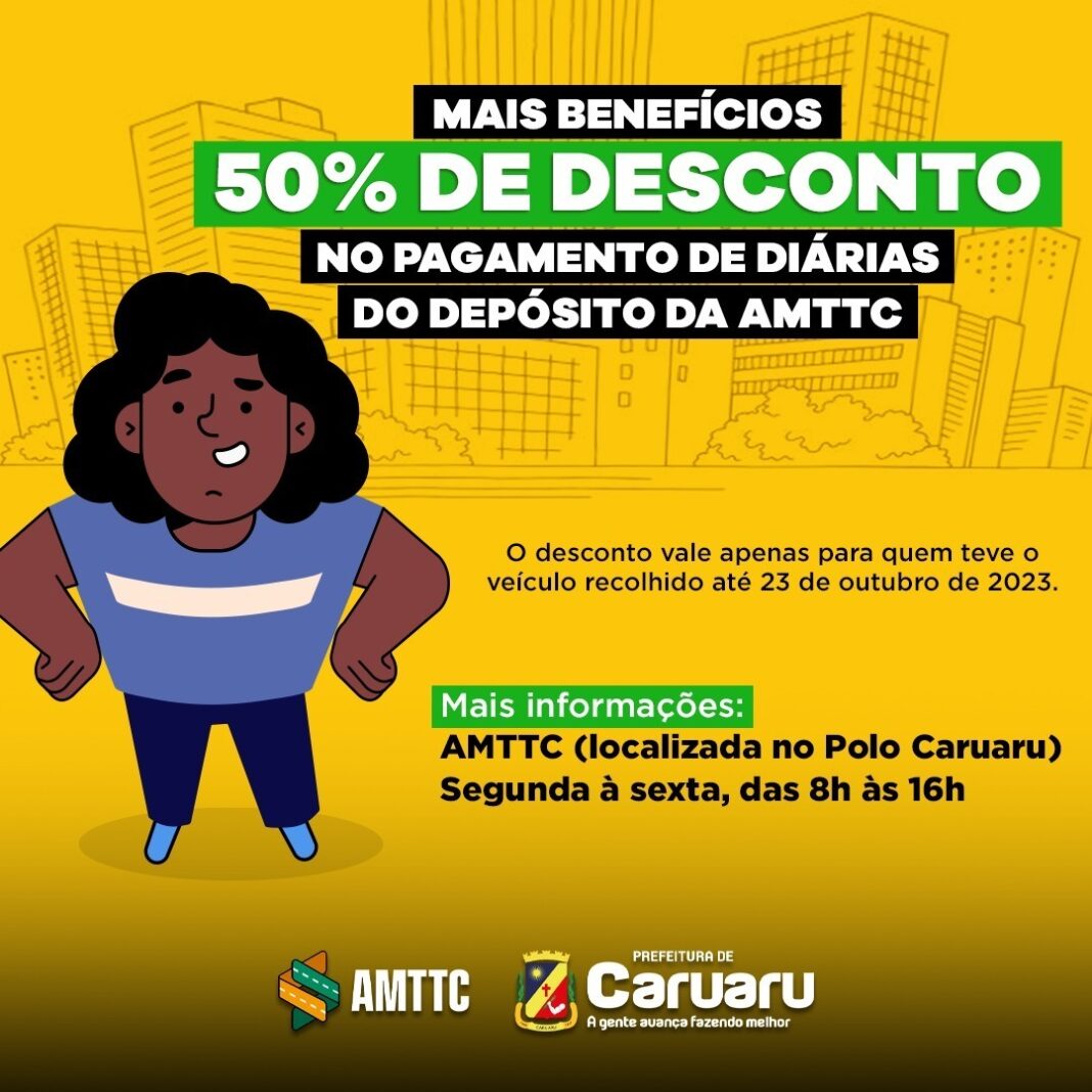A Autarquia de Mobilidade, Trânsito e Transportes de Caruaru (AMTTC) está oferecendo desconto de 50% para pagamento de diárias de veículos que estão retidos no seu depósito. A medida vale para automóveis que estejam num prazo de até seis meses de estadia após a sua retenção, valendo até o dia 23 de outubro de 2023. O desconto será válido até o dia 29 de dezembro deste ano.