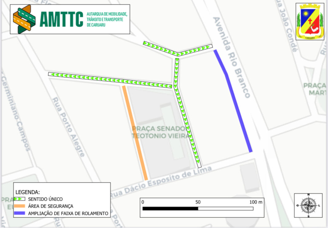 A primeira mudança será no entorno do Palácio Jaime Nejaim. Os condutores que vêm da Avenida Rio Branco sentido Prefeitura Municipal seguirão o fluxo normal pela Rua Dácio Espósito de Lira, sendo proibido entrar à direita na Praça Teotônio Vilela. Os condutores deverão seguir em frente até a rua Porto Alegre.