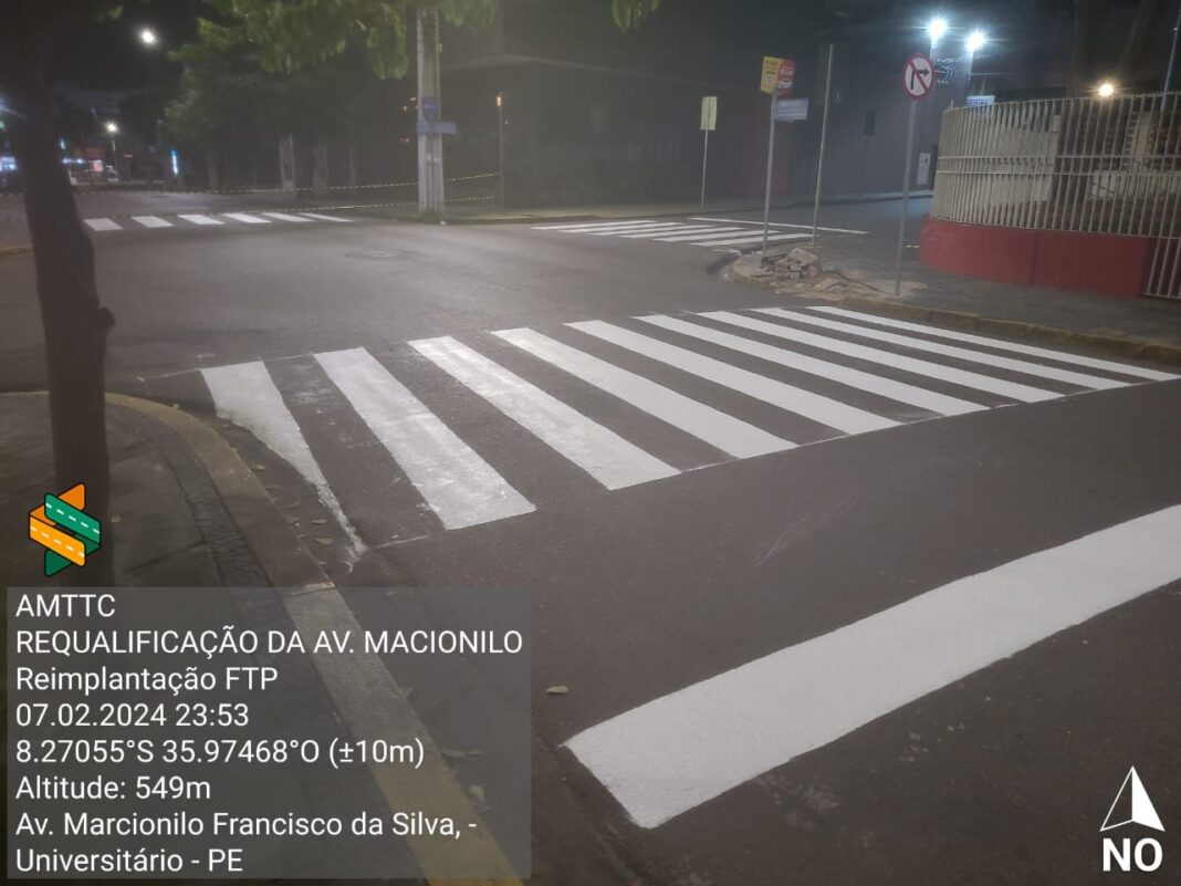 Nos últimos dois meses, 57 faixas de pedestre foram revitalizadas e implantadas em Caruaru, das quais 26 são na frente de escolas, reforçando a segurança viária para os estudantes.