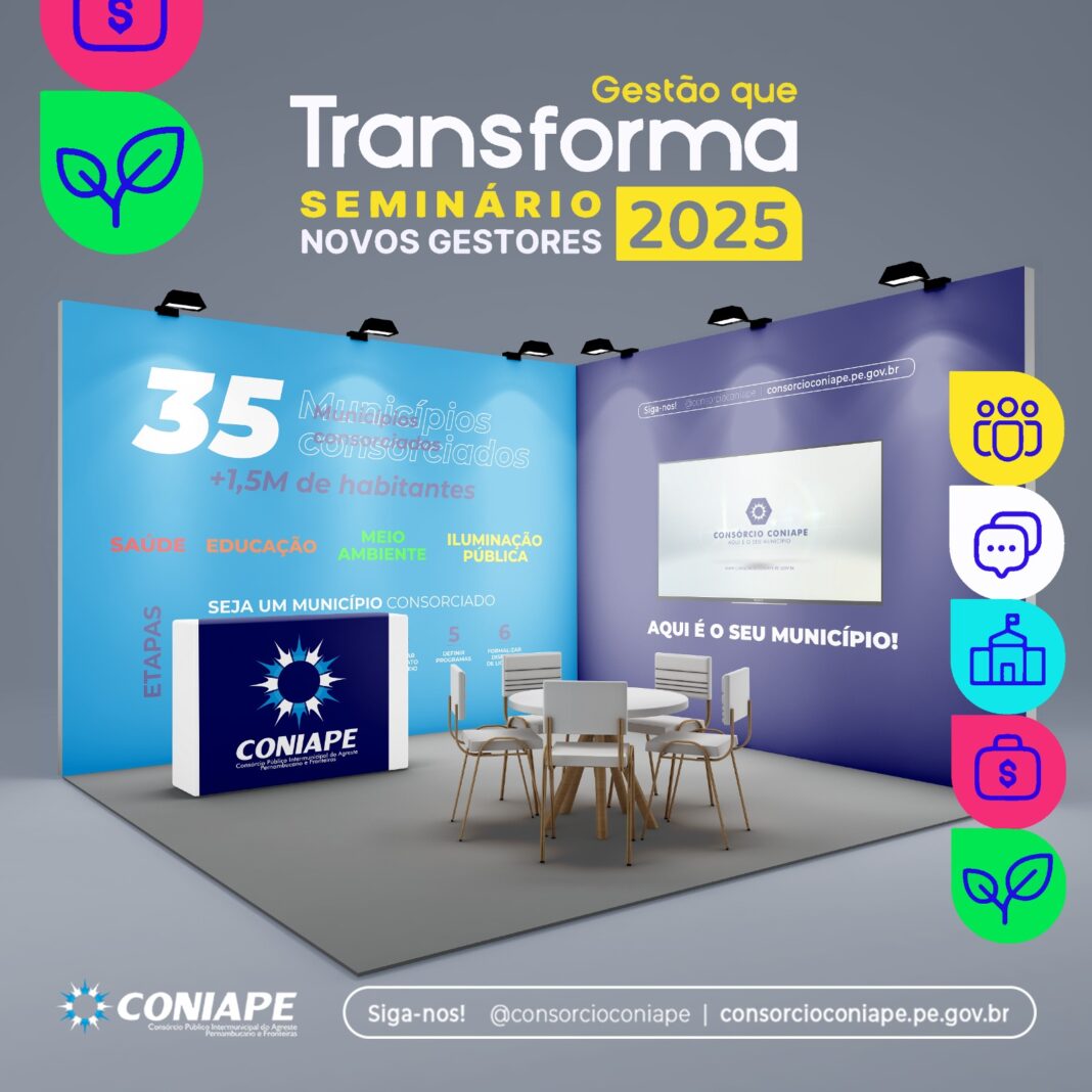 O Consórcio Público Intermunicipal do Agreste Pernambucano e Fronteiras (CONIAPE) estará presente no Seminário Novos Gestores 2025, promovido pela Associação Municipalista de Pernambuco (Amupe), com um stand exclusivo. O evento, que acontece nos dias 11 e 12 de novembro no Hotel Canarius de Gravatá, é voltado aos prefeitos e prefeitas eleitos para a nova legislatura e tem como objetivo promover uma gestão pública transformadora e colaborativa.