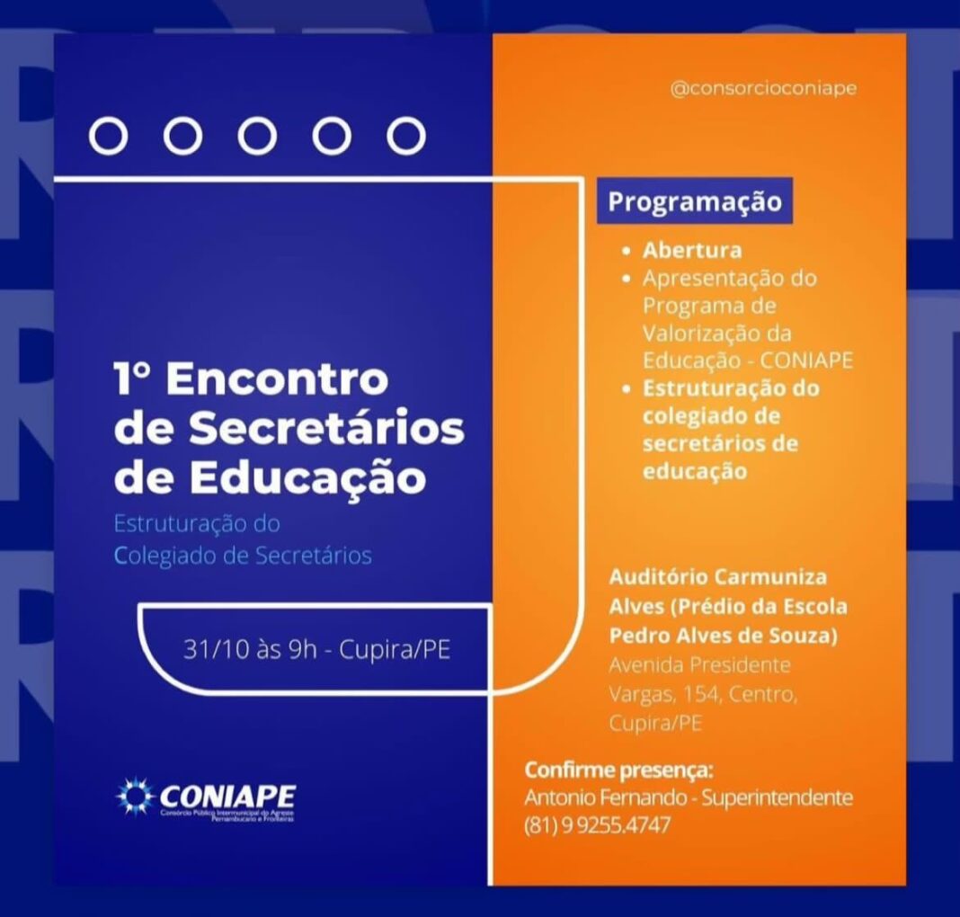 No dia 31 de outubro, o município de Cupira sediará o primeiro encontro de Secretários de Educação dos municípios consorciados ao CONIAPE (Consórcio Público Intermunicipal do Agreste Pernambucano e Fronteiras), um evento de grande importância para o fortalecimento da cooperação intermunicipal na área educacional. O encontro tem como principal objetivo promover a discussão para a formatação do regimento interno do Colegiado de Secretários de Educação, que será posteriormente submetido à aprovação da Assembleia de Prefeitos.