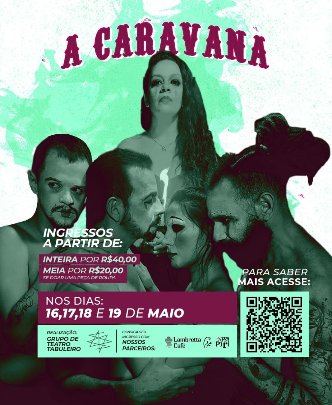 O grupo Tabuleiro de Teatro estreia essa semana, dias 16, 17, 18 e 19 de maio o espetáculo: “A Caravana”, que apresenta a narrativa de uma trupe mambembe, que após a morte do líder, coloca os demais personagens diante de várias incertezas. Em meio a devaneios e dúvidas de qual caminho seguir, o enredo da peça leva a plateia a uma reflexão da dificuldade da sobrevivência do artista em nosso país. Órfãos de pai e de líder, o conflito central da trama gira em torno da dúvida que acomete a trupe, entre, conservar suas tradições ou abrir as portas para um novo mundo, e ainda ao fato do artista ter se tornado maior do que a própria arte.