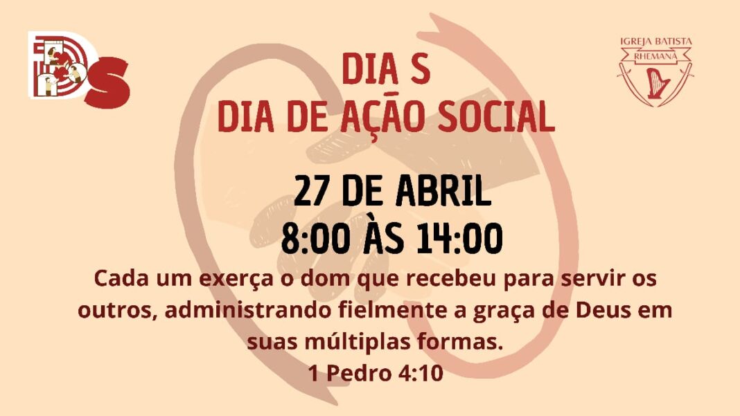 A Igreja Batista Rhemaná em Caruaru convida toda a população para no próximo dia 27 de abril participar do Dia S, um dia voltado à ação social, onde são ofertados vários serviços para a população totalmente gratuitos.