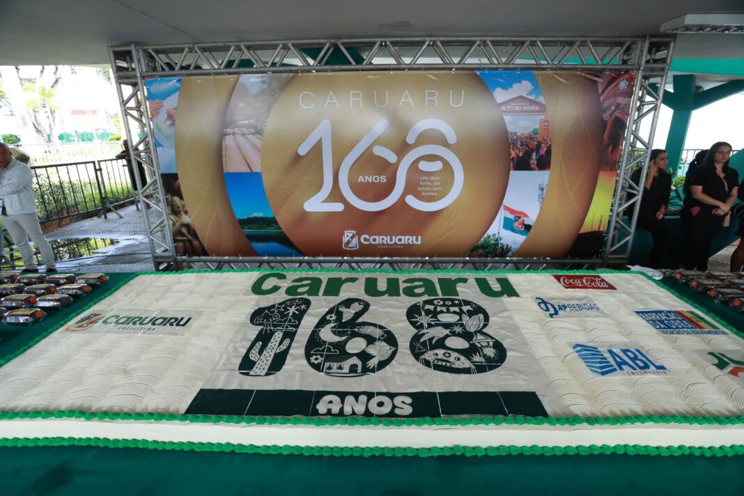 O tradicional corte do bolo foi realizado na Prefeitura de Caruaru, reunindo dezenas de pessoas, que foram celebrar os 168 anos da Princesa do Agreste ao lado das autoridades e servidores presentes. O bolo tinha 4 metros e, além disso, foram distribuídas 500 marmitas.