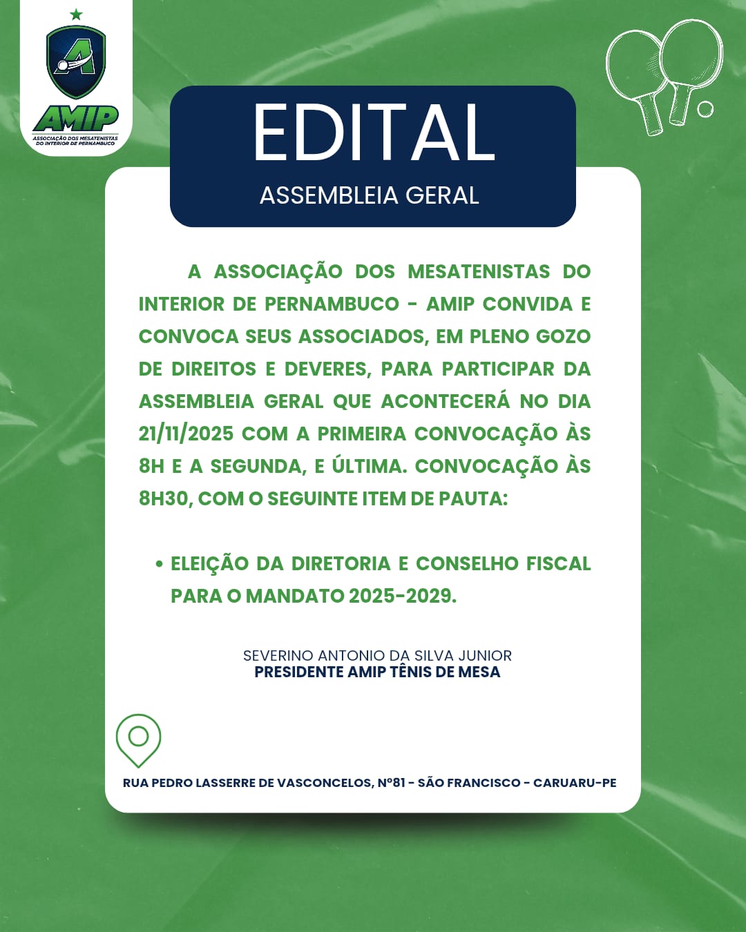 A Associação dos Mesatenistas do Interior de Pernambuco – AMIP Tênis de Mesa, associação civil sem fins lucrativos, inscrita no CNPJ sob nº 46.310.821/0001-25, torna pública a convocação de seus associados para a Assembleia Geral Eleitoral, que será realizada no dia 21 de novembro de 2025, na sede da AMIP, localizada à Rua Pedro Lasserre de Vasconcelos, nº 81, Bairro São Francisco, Caruaru–PE.