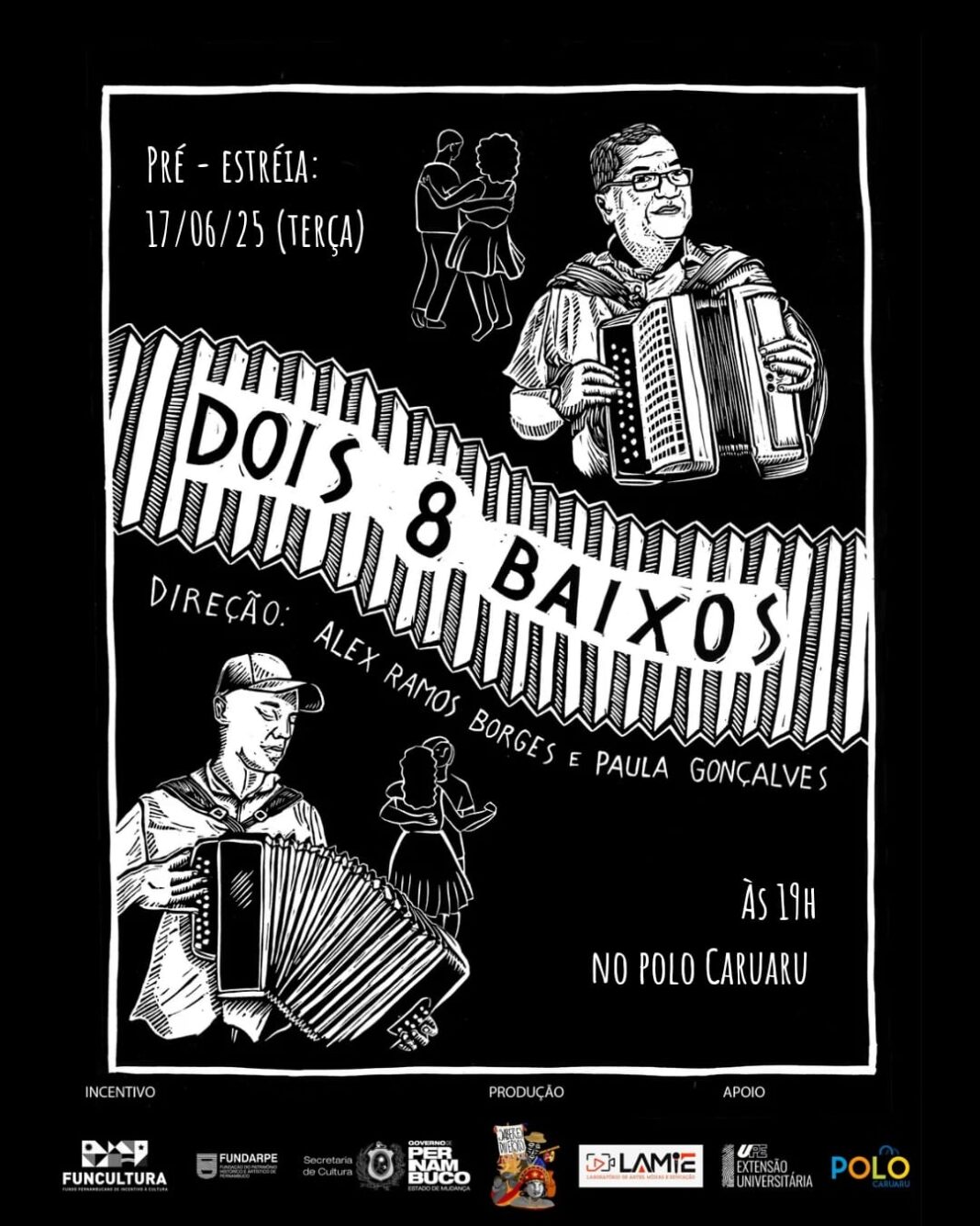 O filme Dois 8 Baixos, que marca a estreia dos diretores Alex Borges e Paula Gonçalves no audiovisual e tem o incentivo do Funcultura (Governo do Estado de Pernambuco), está centrado na relação dos músicos Luizinho Calixto e Ivison Santos com a sanfona de 8 baixos. Luizinho Calixto, natural de Campina Grande, é um reconhecido mestre do oito baixos, tendo tocado com diversos artistas de reconhecimento nacional e desenvolvido um método próprio de ensino com o qual faz questão de propagar o instrumento por todos os lugares que passa. Já Ivison Santos é um experiente jovem multinstrumentista de Caruaru que encontrou na sanfona de 8 baixos uma possibilidade estética para novas experimentações.