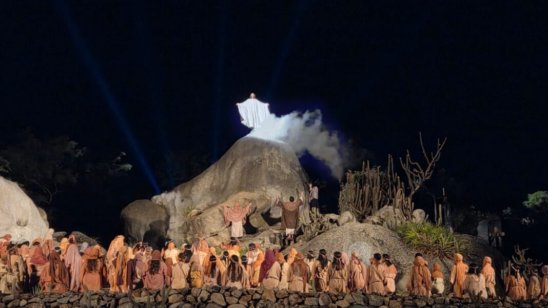 Com a participação de mais de 400 atores e figurantes, o espetáculo narra a história bíblica dos últimos dias de Jesus na terra . A cidade teatro possui uma área de 100 mil m² cercada por muralhas de pedra de três metros de altura e 70 torres de sete metros. Em seu interior, nove palcos plateia reproduzem ambientes como arruados, lagos, jardins, palácios e o imponente Templo de Jerusalém, proporcionando uma ambientação realista e envolvente para o público.