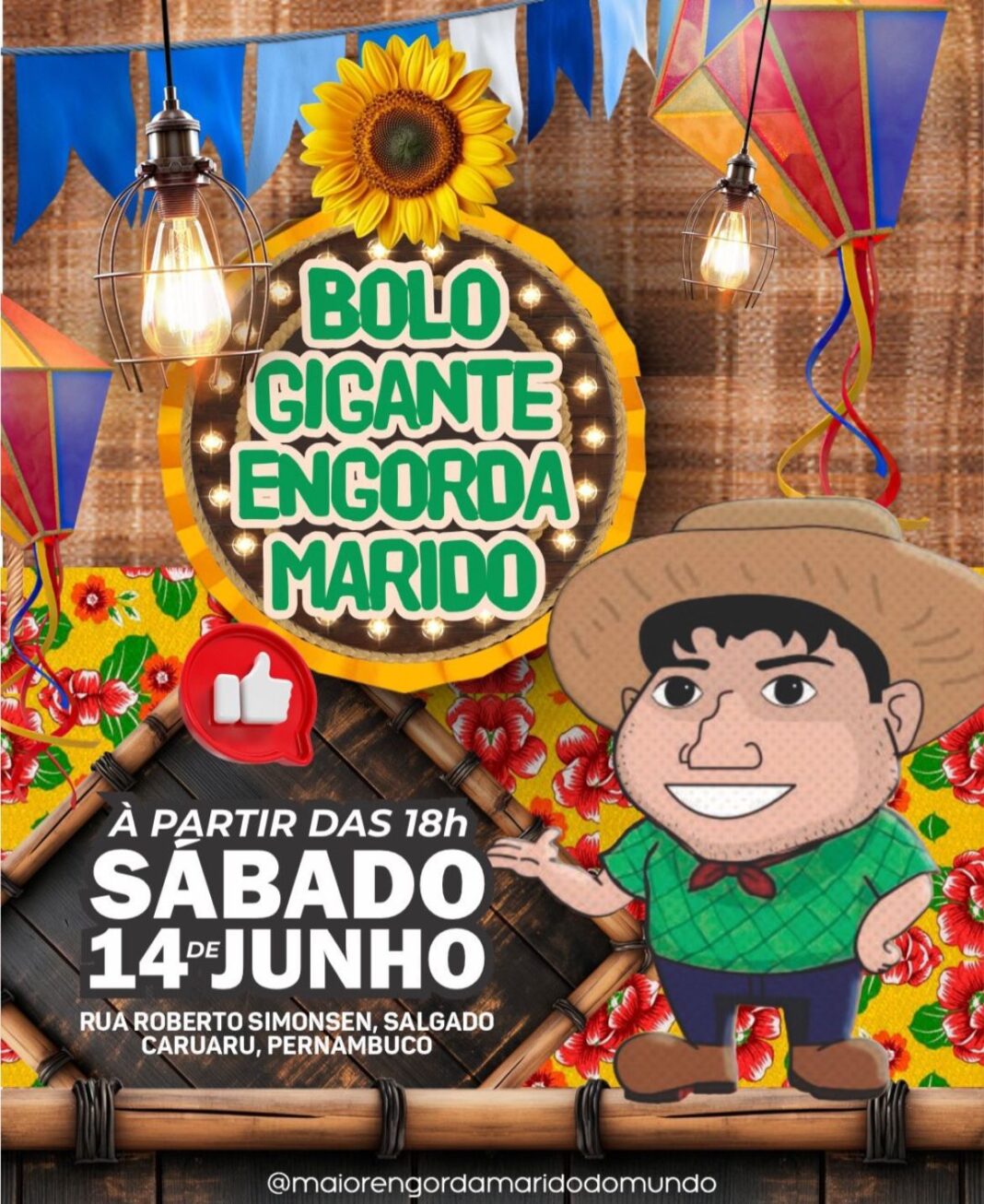 A quinta edição do Bolo Engorda Marido será realizada, neste sábado (14), na Rua Roberto Simonsen, perto da caixa d´água, no Bairro do Salgado, a partir das 18h. O evento contará com a participação do Trio Pé de Serra Carrapicho, Companhia de Dança Flávio Barbosa, Jordi do Acordeon, Banda de Pífanos Alvorada, Batalhão de Bacamarteiro 28, além das apresentações dos Grupos Vida Ativa em Movimento, Dança Arte e Cultura e muito mais.
