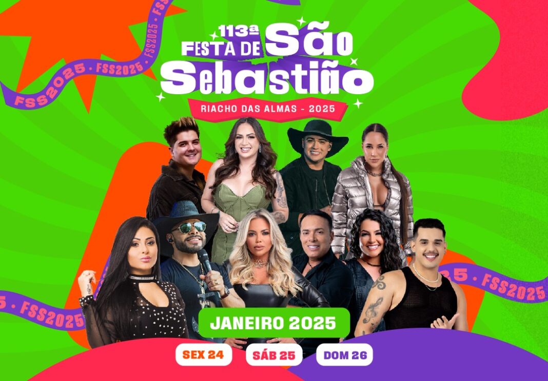 A Prefeitura de Riacho das Almas anunciou a programação completa da 113ª edição da Festa de São Sebastião, uma das mais tradicionais e aguardadas celebrações do município. O evento será realizado nos dias 24, 25 e 26 de janeiro, no Pátio de Eventos da cidade, trazendo grandes atrações musicais como Raphaela Santos, Natanzinho Lima, Eric Land e muitos outros artistas renomados.