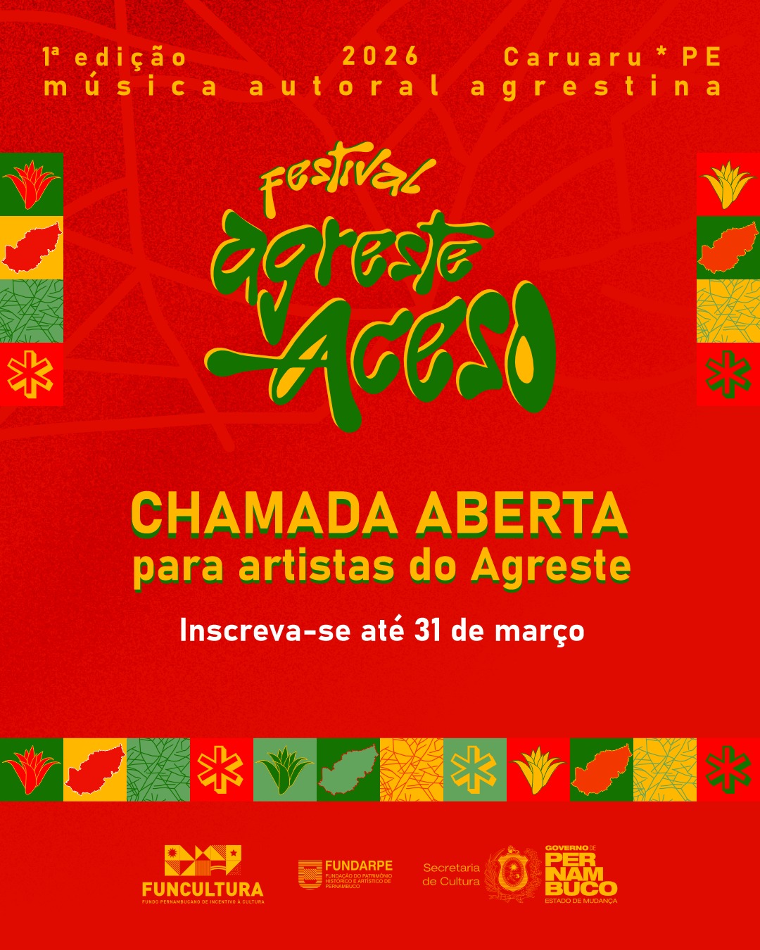 Estão abertas as inscrições para a chamada pública do Festival Agreste Aceso, que terá sua primeira edição neste ano. O processo irá selecionar oito projetos musicais para integrar a programação do evento, que acontecerá no mês de maio, em Caruaru. Para se inscrever, é preciso preencher o formulário disponível em: https://forms.gle/V5hFrzAmfohKqyKo6 até o dia 31 de março.
