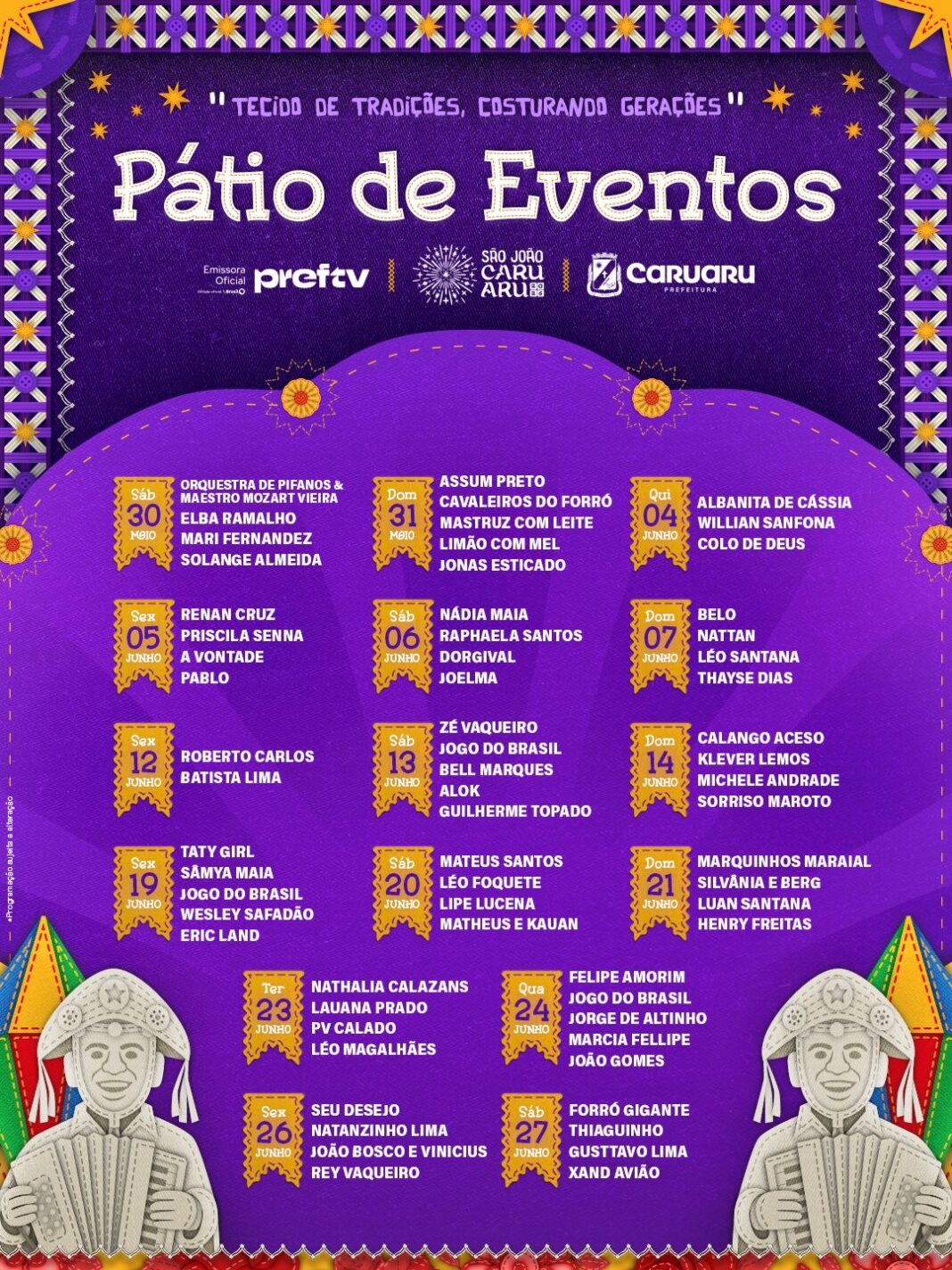 “A nossa programação fica cada ano melhor, com novidades, valorização dos nossos artistas, grandes atrações, opções para todos os públicos e movimentando o turismo e a economia porque o São João de Caruaru é isso”, enfatizou o prefeito Rodrigo Pinheiro.